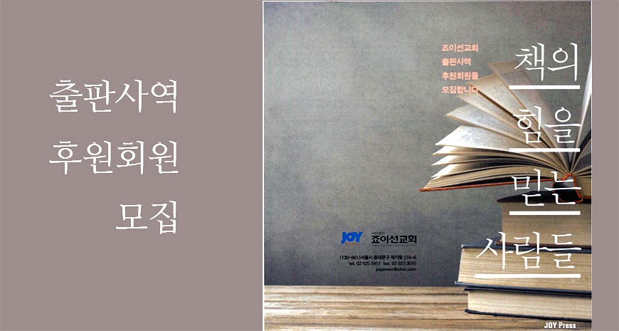정말 책의 힘을 믿으신다면 이 일에 힘을 더해 주시기 바랍니다. 죠이북스 출판사역의 후원회원이 되어 주십시오. 이것은 날로 어려워지는 문서 사역 현장에 힘을 더하는 것일 뿐 아니라 하나님을 전하고 알리는 일에, 그 나라를 확장하는 일에 함께하시는 것입니다.